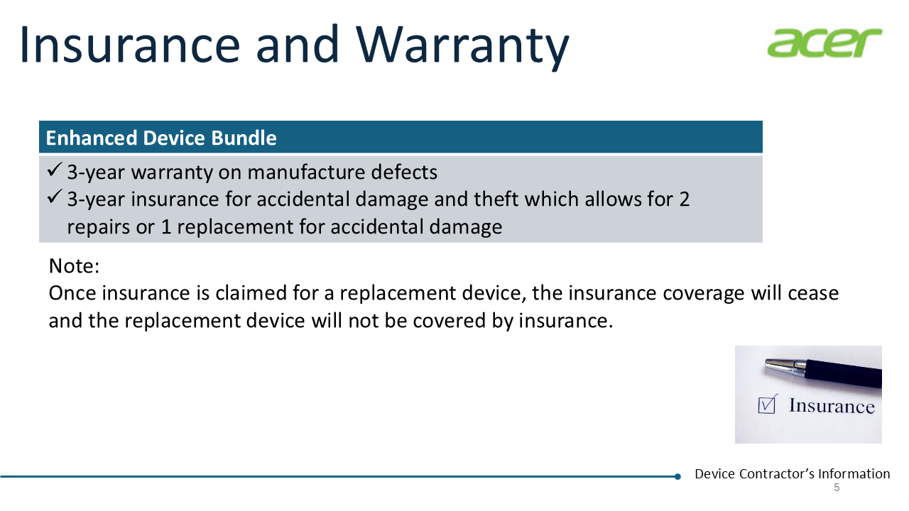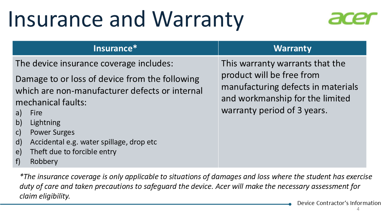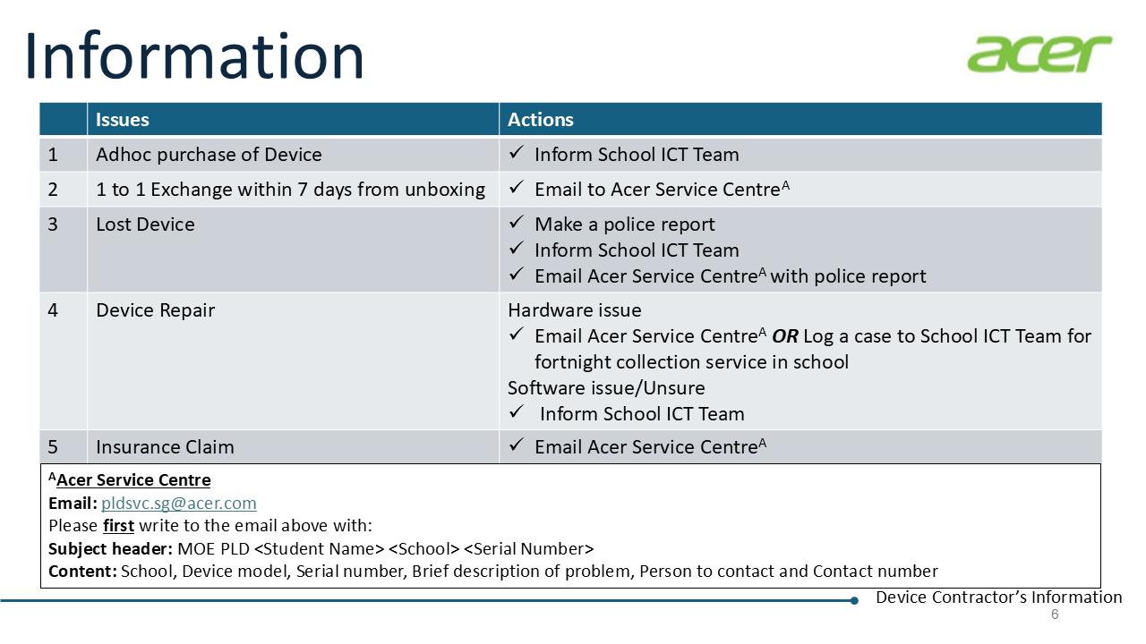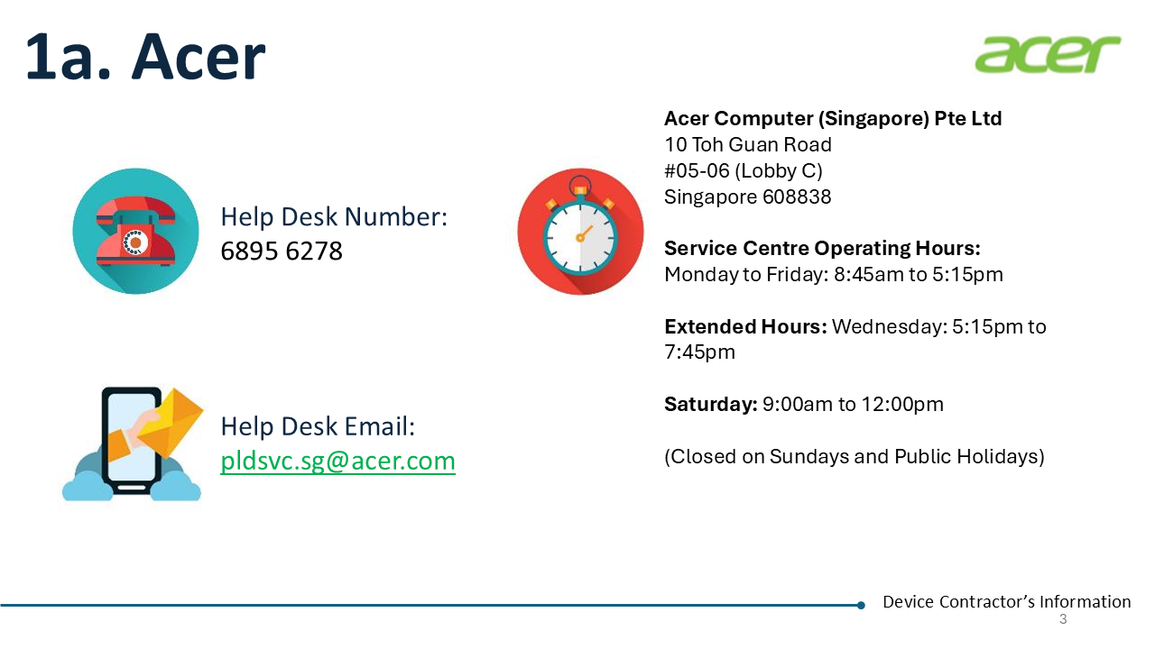 Sec 1 students (2022) owns the Acer R752TN PLD. Should there be a need to send the device for immediate repairs, or queries about the device, insurance and warranty, you may contact the device contractor from Acer Singapore Pte Ltd directly.