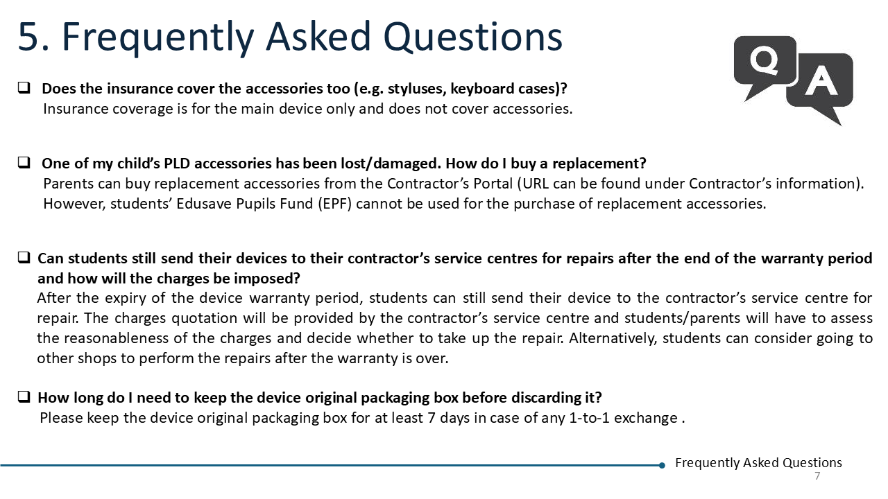 Parents/students can also bring the device to the Contractor's Service Centre. Parents/students are advised to contact Contractor’s helpdesk (T: 800 852 8100). Parents/students will need the following information such as their device serial number, brand and model of the device, their name and contact number to log a case with the helpdesk.